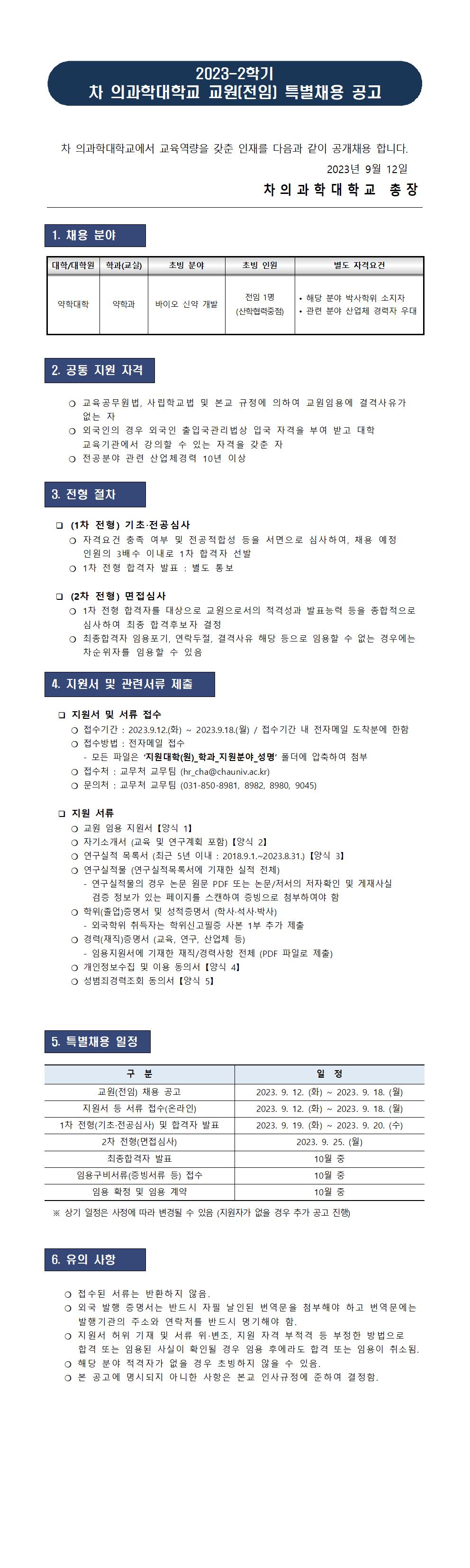 2026학년도 1학기 차 의과학대학교 교원(전임) 2차 공개채용 공고