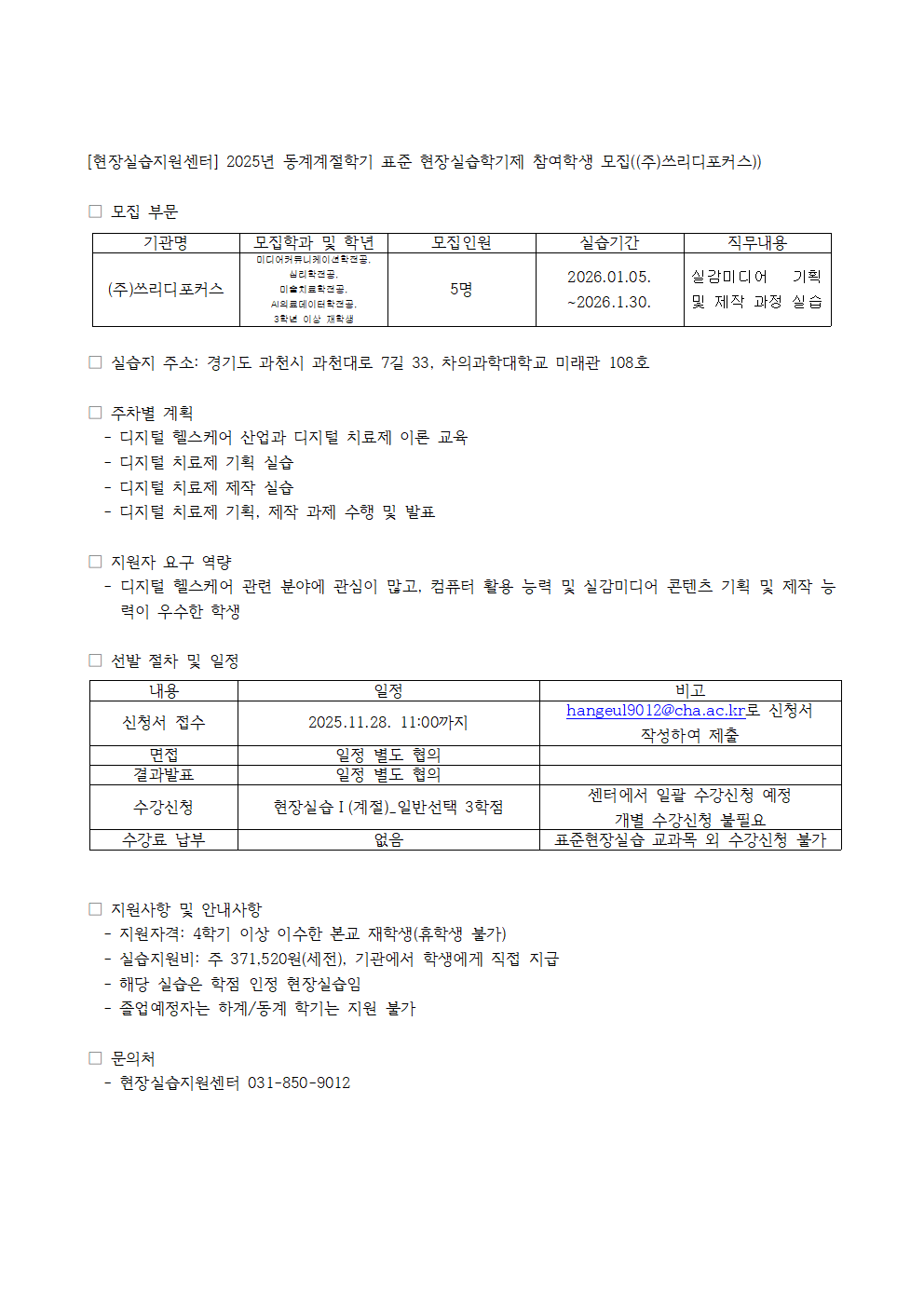 [현장실습지원센터] 2025년 동계계절학기 표준 현장실습학기제 참여학생 모집((주)쓰리디포커스))